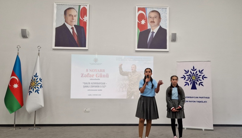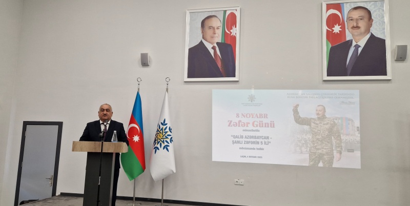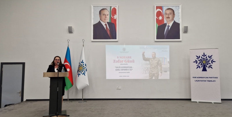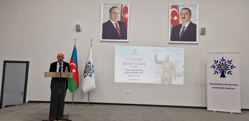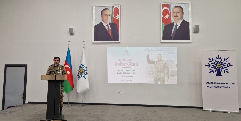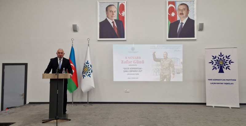 Yeni Azərbaycan Partiyası Laçın rayon təşkilatının sədri İlqar İlyasov Azərbaycan Konstitusiyasının qəbulunun 30 ili və 44 günlük Vətən müharibəsində qazanılmış Zəfərin 5 illiyi münasibətilə tədbir iştirakçılarını təbrik edərək bildirib ki, 8 Noyabr xalqımızın milli qürur günü, tarixi ədalətin və beynəlxalq hüququn təntənəsi, ölkəmizin ərazi bütövlüyü və suverenliyinin bərpa olunduğu gün kimi tariximizə əbədi həkk olunub. O vurğulayıb ki, Ümummilli Lider Heydər Əliyevin böyük arzusu olan torpaqlarımızın azad edilməsi və ərazi bütövlüyümüzün bərpası Azərbaycan Respublikasının Prezidenti cənab İlham Əliyevin uzaqgörən siyasəti, mükəmməl diplomatiyası, strateji düşüncəsi, xalqımızın əzmi və iradəsi, dövlətimizin iqtisadi qüdrəti, müasir ordu quruculuğu və xalq–iqtidar birliyi sayəsində gerçəkləşmişdir.
