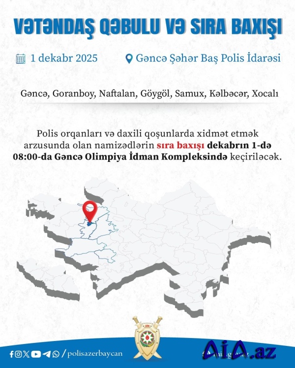 Polis orqanları və daxili qoşunlarda xidmət etmək arzusunda olan namizədlərin sıra baxışı isə vətəndaş qəbulundan öncə, yəni dekabrın 1-də 08:00-da Gəncə Olimpiya İdman Kompleksində keçiriləcək.