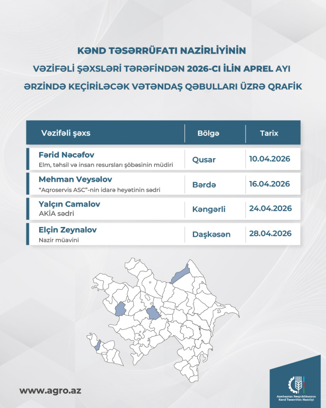 Aia.az xəbər verir ki, Vətəndaş qəbulu qrafikdə nəzərdə tutulmuş rayonun Dövlət Aqrar İnkişaf Mərkəzində keçirilir. Vətəndaş qəbulunda iştirak etmək istəyən şəxslər Kənd Təsərrüfatı Nazirliyinin “Çağrı Mərkəzi”nə (1652) zəng etməklə qeydiyyatdan keçə bilərlər. Qəbula gələn vətəndaşlar əvvəlcədən qeydiyyatdan keçməli və şəxsiyyətlərini təsdiq edən sənədləri özləri ilə gətirməlidirlər.