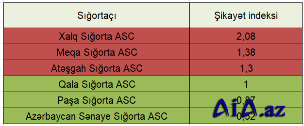 Siyahının sonunda isə 0,52 şikayət indeksi ilə “Azərbaycan Sənaye Sığorta” ASC yer alıb.