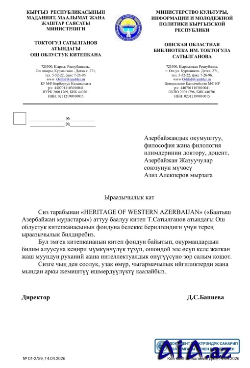 Sizin tərəfinizdən “HERITAGE OF WESTERN AZERBAIJAN” (“Qərbi Azərbaycanın irsi”) adlı dəyərli kitabın T. Satılqanov adına Oş Vilayət Kitabxanasının fonduna hədiyyə edilməsi münasibətilə Sizə dərin minnətdarlığımızı bildiririk.